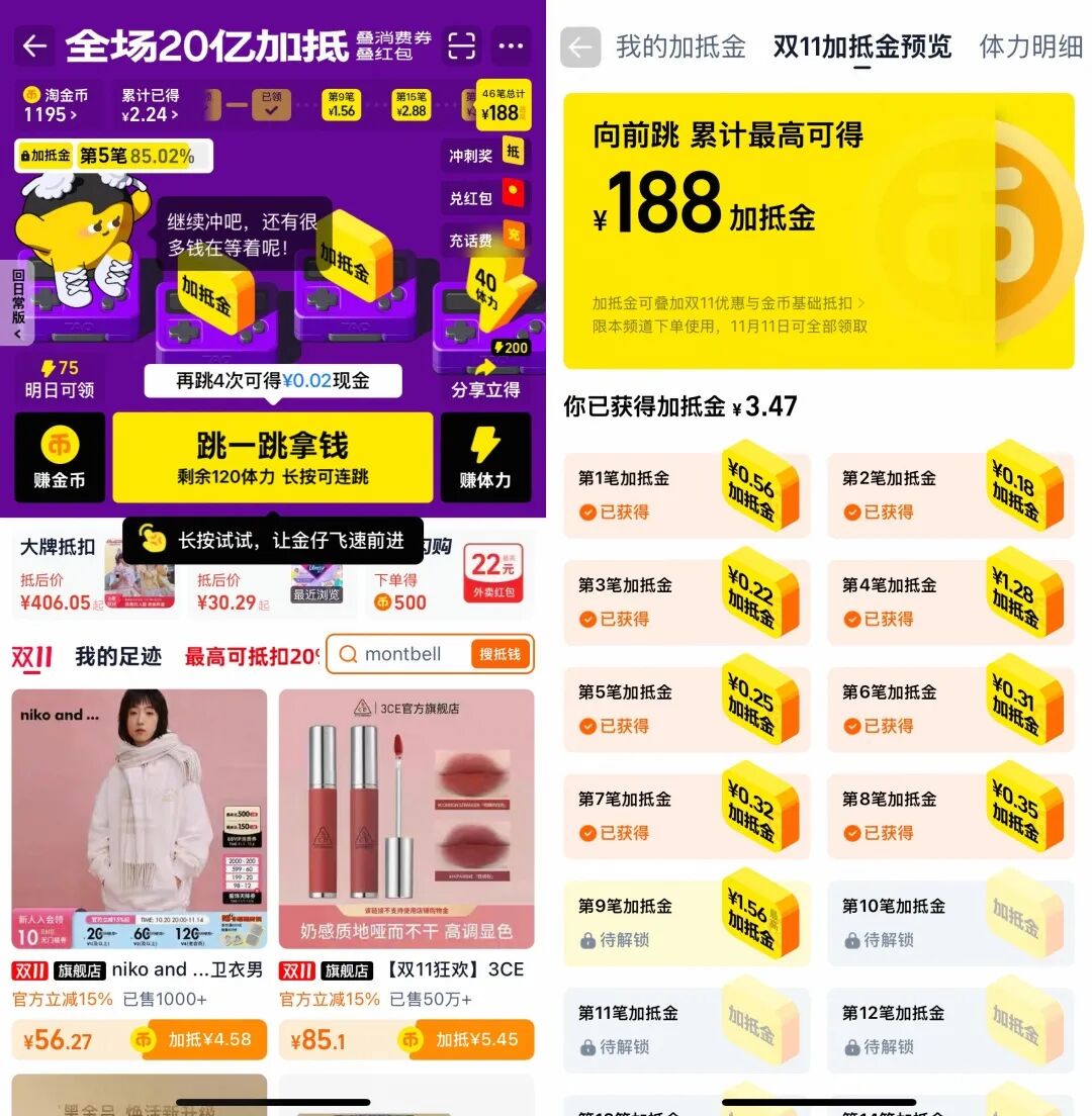平日里,用戶在淘寶首頁的「淘金幣」頻道,通過簽到、玩游戲、加好友、下單、確認收貨等行為可獲得一定數量的淘金幣。今年618和雙11,淘金幣額外推出「跳一跳獲加抵金」玩法,用戶可通過小游戲額外賺一份補貼,累計最高可得188元補貼。