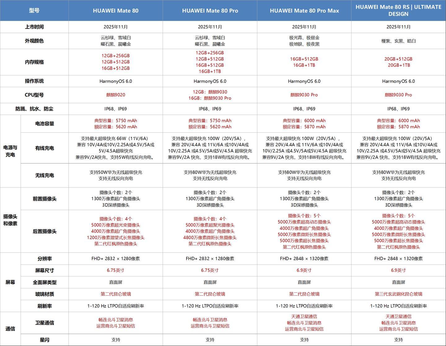 IT之家匯總華為 Mate 80 系列手機重點參數配置差異如下: