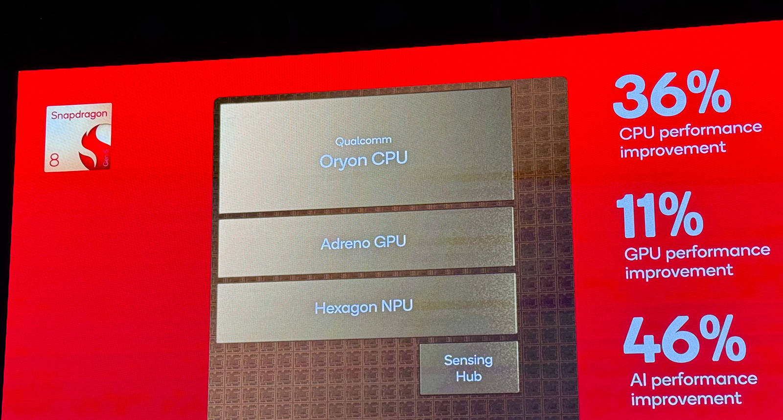 第五代驍龍8由3nm先進(jìn)制程工藝N3P打造,能為設(shè)備整機(jī)續(xù)航提升13%。其采用高通定制Oryon CPU,由兩個(gè)3.8GHz超級(jí)內(nèi)核與六個(gè)3.32Ghz性能內(nèi)核組成,相比第三代驍龍8單核性能提升35%,多核提升36%,CPU能效更是領(lǐng)先多達(dá)42%。