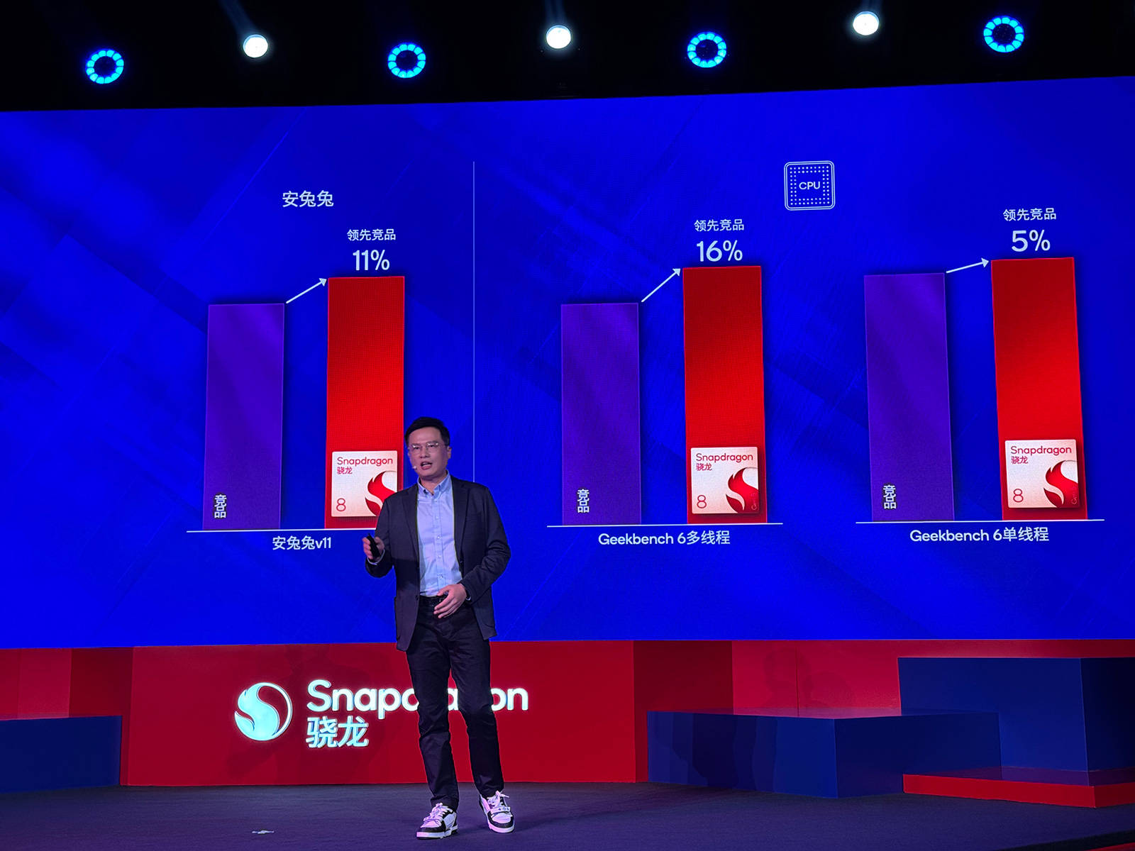 高通技術(shù)公司產(chǎn)品市場(chǎng)高級(jí)總監(jiān)馬曉民表示,相比競(jìng)品,第五代驍龍移動(dòng)平臺(tái)運(yùn)行安兔兔v11的跑分領(lǐng)先11%,在Geekbench測(cè)試中,CPU多核表現(xiàn)領(lǐng)先16%,多核領(lǐng)先5%,并且能效也有更優(yōu)秀的成績(jī)。