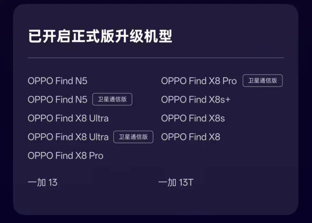 已開啟正式版升級機型:OPPO Find N5、OPPO Find N5 衛星通信版、OPPO Find X8 Ultra、OPPO Find X8 Ultra 衛星通信版、OPPO Find X8 Pro、OPPO Find X8 Pro 衛星通信版、OPPO Find X8s+、OPPO Find X8s、OPPO Find X8、一加 13、一加 13T。