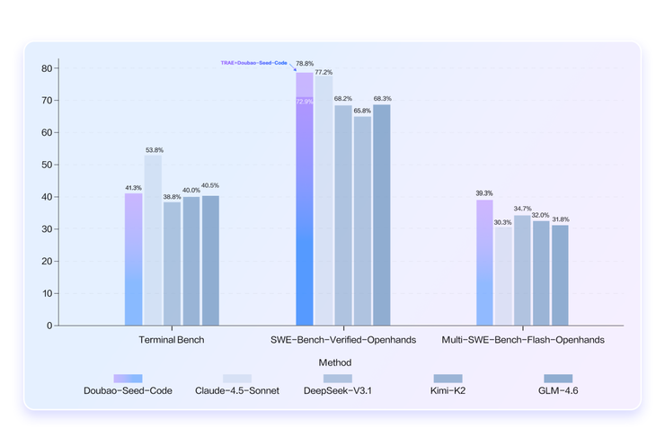 豆包編程模型通過大規模Agent強化學習訓練,在真實編程場景中效果出色,且展現出良好的泛化能力。與TRAE開發環境深度結合后,豆包編程模型在SWE-Bench Verified榜單中以78.8%的得分達到業界最佳水平,充分驗證了模型與工具深度適配后的協同效應。