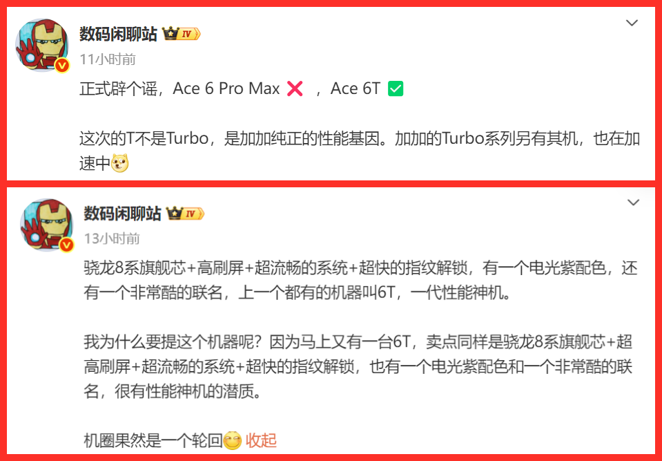 而持續(xù)發(fā)酵的“驍龍8系旗艦+超大電池”爆料,在博主一句“Ace 6 Pro Max ?,Ace 6T ?”的辟謠中塵埃落定。