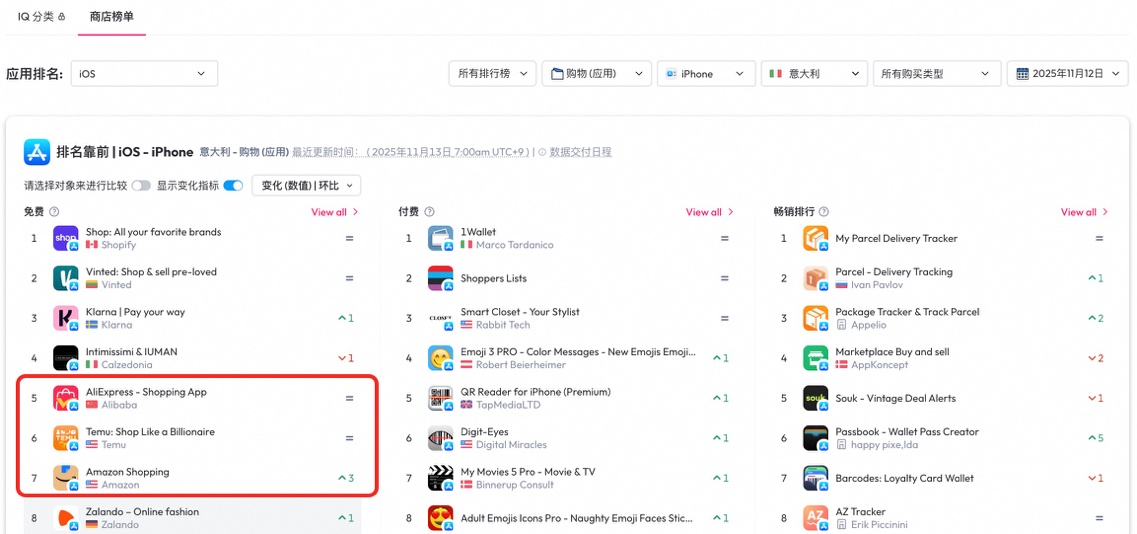 據iOS應用商店數據,海外雙11首日,速賣通在西班牙、英國、巴西、日本、意大利等多國下載榜已超過亞馬遜。