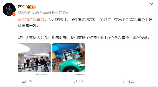 雷軍:歡迎大家逛廣州車展,小米展臺將發放礦泉水和1萬個合金車模