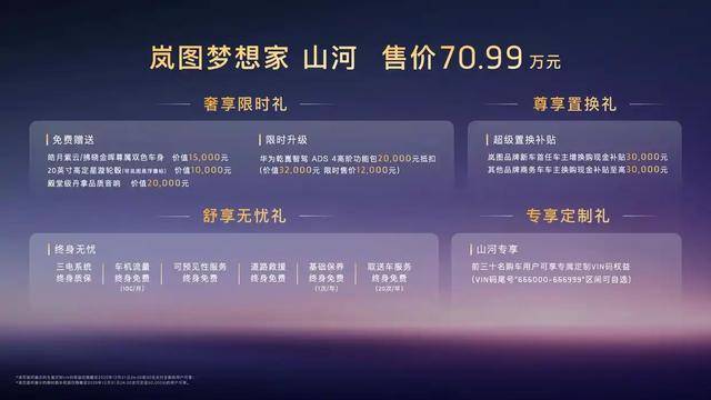 在2025廣州車展上,嵐圖夢想家山河版正式宣布上市,推出單一配置車型,官方指導(dǎo)價為70.99萬元。這款新車將于12月起在全國主要城市展開巡展活動,消費者可前往現(xiàn)場近距離感受其獨特魅力。