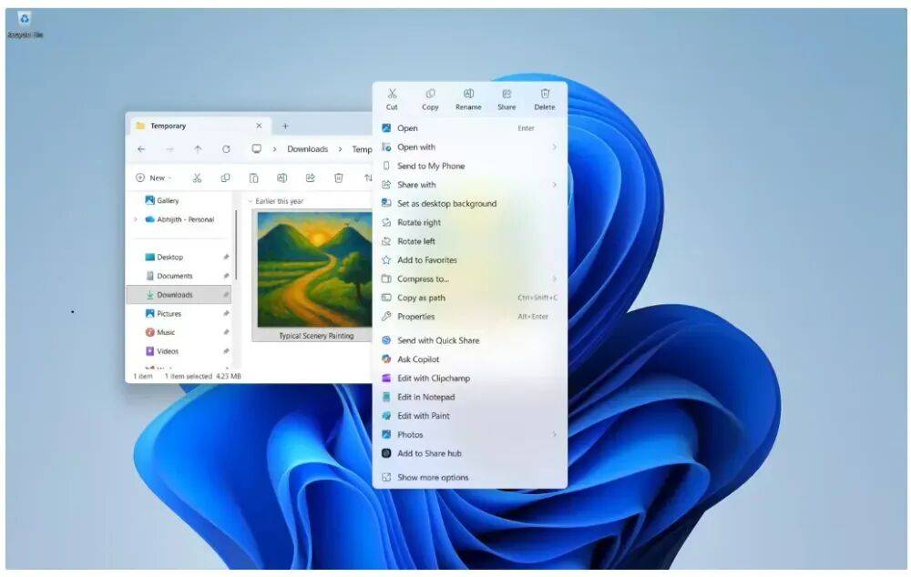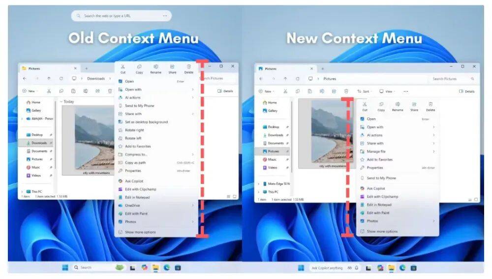 微軟引入了一個名為“管理文件”(Manage file)的全新子菜單,收納“壓縮到 ZIP 文件”、“復(fù)制為路徑”、“設(shè)為桌面背景”以及圖片的“向左旋轉(zhuǎn)”和“向右旋轉(zhuǎn)”等五個獨立選項。