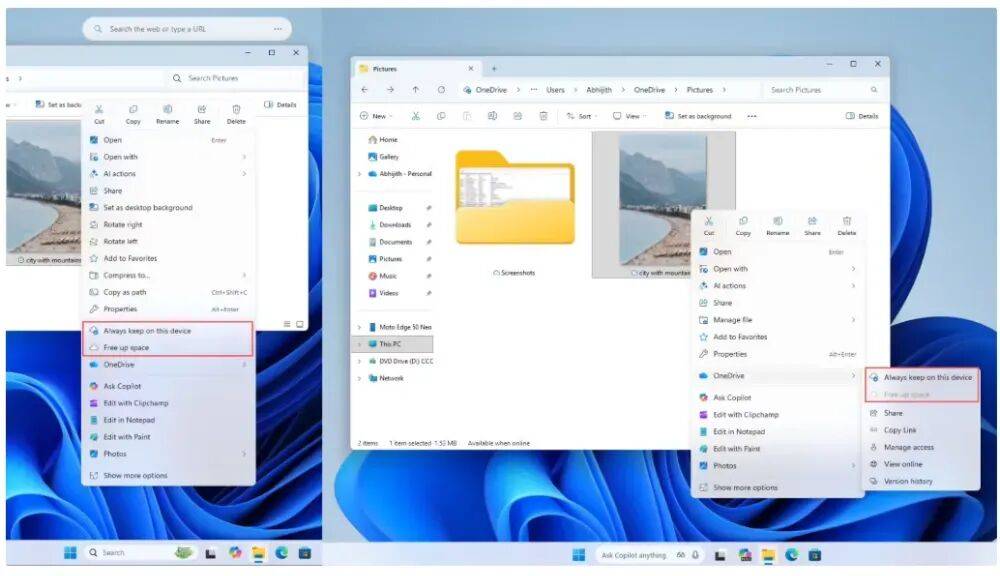 對于已同步到 OneDrive 等云盤的文件,原先獨立顯示的“始終保留在此設(shè)備上”和“釋放空間”兩個選項,現(xiàn)在被統(tǒng)一歸入相應(yīng)云服務(wù)(如 OneDrive)的專屬子菜單下。