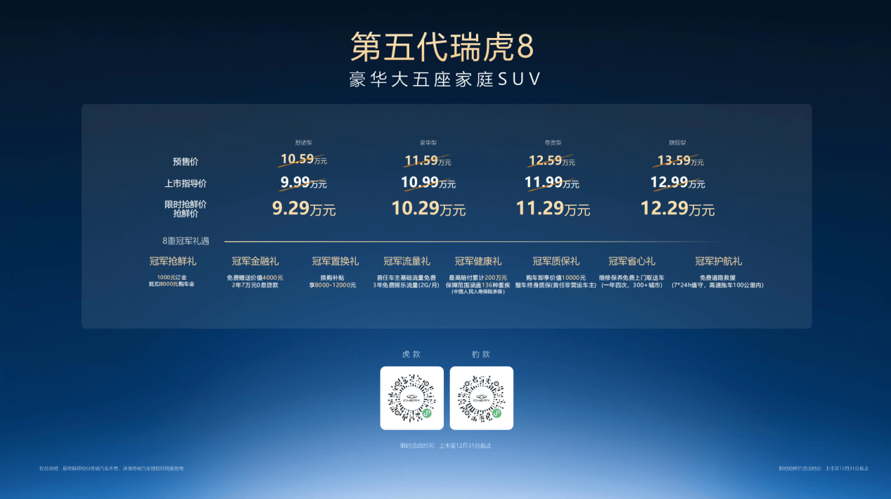 第五代瑞虎8上市限時搶鮮價為9.29萬元起,同時還誠意推出8重冠軍禮遇,讓消費者購車更輕松、用車更省心!
