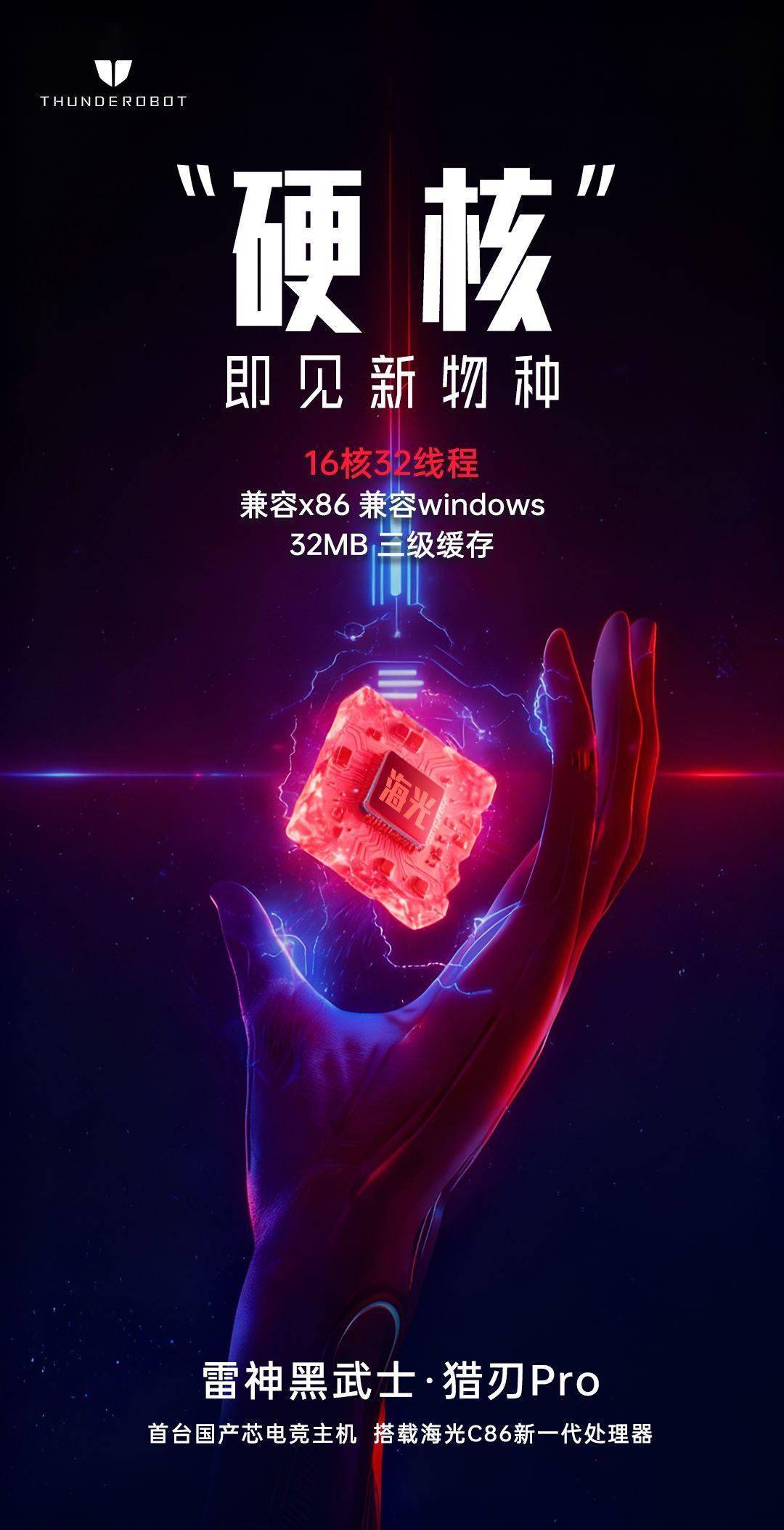 11 月 28 日消息,THUNDEROBOT 雷神今日表示,其上周發布首臺國產芯電競主機黑武士?獵刃 Pro 搭載的海光 C86 新一代處理器擁有 16 核心 32 線程的規格,配備 32MB 的 L3 高速緩存,兼容 Windows 操作系統。