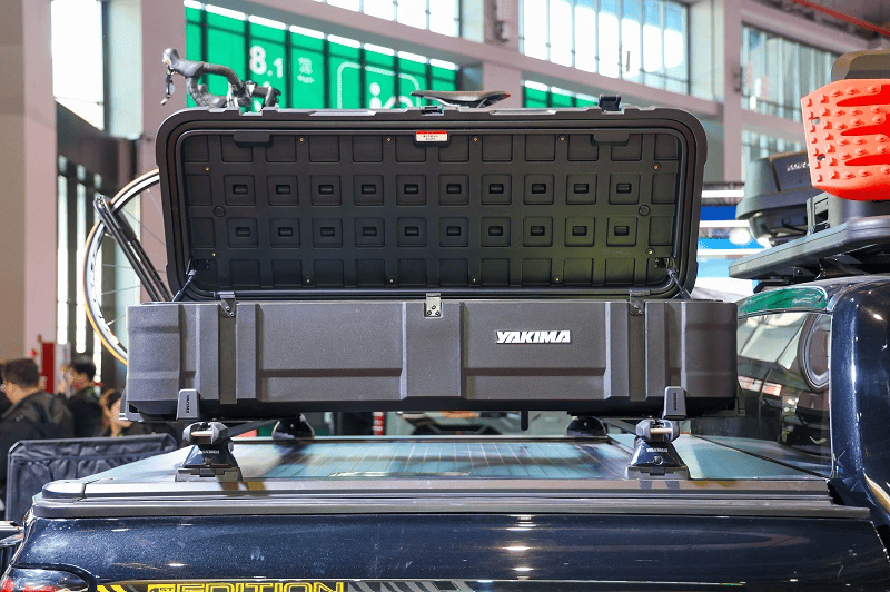 皮卡支架上搭載著SkyFort 天空要塞車頂戰術箱,這是一款為硬核探險家打造的終極裝備,一體成型,無接縫設計,擁有卓越的抗沖擊、抗壓和防水性能,還有四角防爆底座+液壓開關設計。它就像一位沉默可靠的旅途伙伴,無懼風雨顛簸,牢牢守護每一件重要裝備。