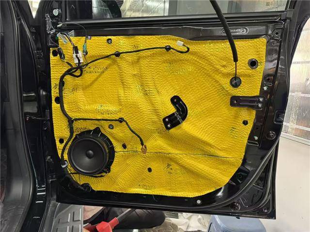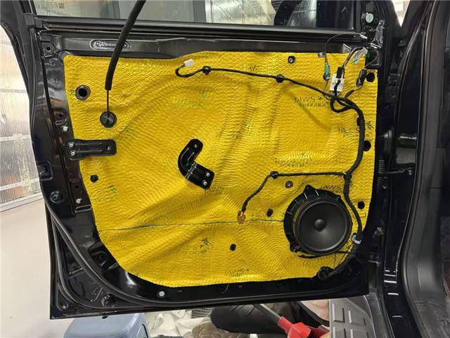 原車門板鐵皮結構比較單薄,車門內部隔音措施做的也不是很到位,風噪很容易通過門板傳入到車廂內部,技師使用金鯊JS300對四門做止振處理,讓門板形成一個密封箱體,有效減少了風噪的傳入。