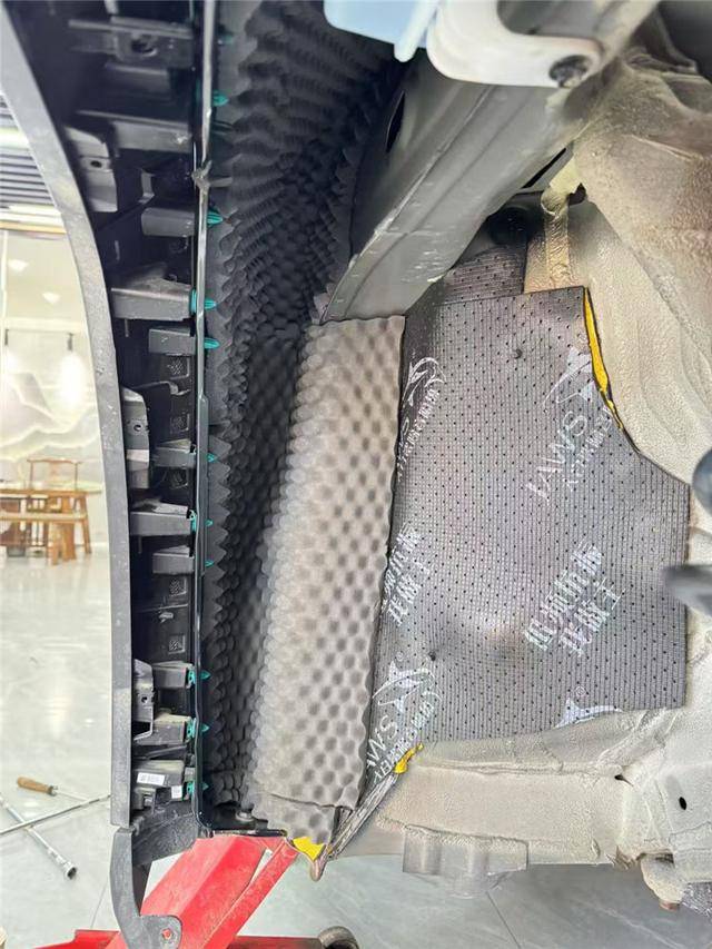 底盤和后備箱是低頻共振的主要產生部位,技師先使用金鯊JS300對底盤和后備箱做止振處理,減少低頻共振的產生;再使用隔音墊對底盤和后備箱做隔音處理,減少噪聲的傳播;最后使用銀鯊棉對底盤和后備箱做吸音處理,將噪聲進一步吸收,以保證隔音的效果。