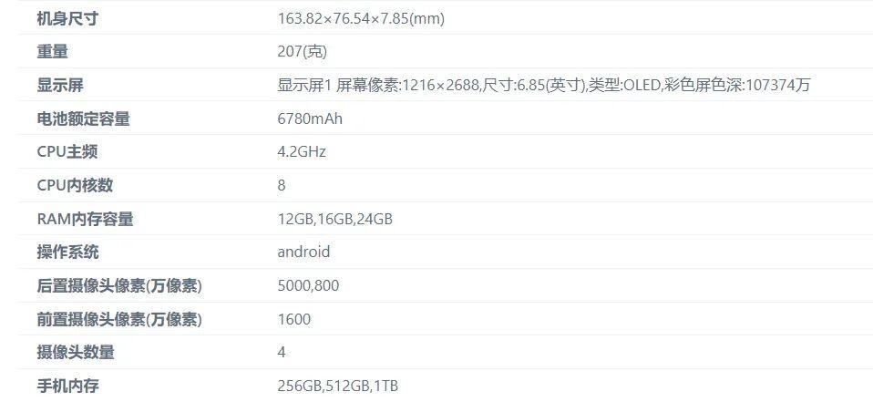 其他方面,該機將搭載高通驍龍 8 至尊版處理器,采用了一塊 7000mAh 電池(額定容量 6780mAh),提供了 12/16/24GB 內存、256/512/1TB 機身存儲;前置 16MP 自拍攝像頭,后置 50MP 主攝 + 8MP 超廣角鏡頭。