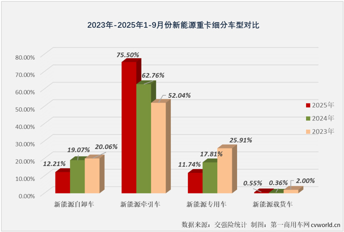 2025年9月份,新能源自卸車在新能源重卡市場占到10.65%的比重,較上月(10.67%)略微下降。今年1-9月,新能源自卸車在新能源重卡市場占到12.21%的比重,低于2024年全年16.03%的占比,與去年同期(19.07%)相比則下滑了接近7個百分點(如上圖)。