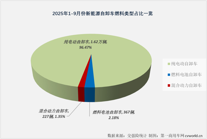 從燃料種類看,2025年新能源自卸車技術路線以純電動為主,這和整個新能源重卡市場情況相同,純電動車型在自卸車領域的占比略低于在整個新能源重卡市場占比(97.83%)。2025年1-9月,在全國各地掛牌上路的1.68萬輛新能源自卸車包括1.62萬輛純電動車型(其中有4479輛為換電自卸車)、227輛混合動力自卸車和367輛燃料電池自卸車,占比分別為96.47%、1.35%和2.18%。
