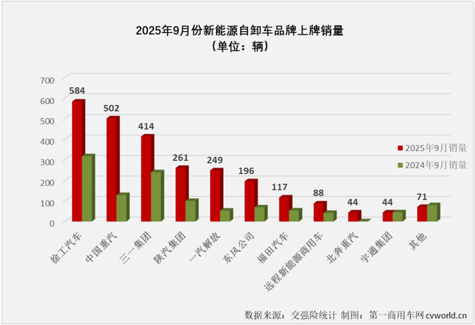根據第一商用車網掌握的終端銷量數據(交強險口徑,不含出口和軍車),2025年9月份,國內新能源重卡銷售2.41萬輛,環比今年8月份增長36%,同比增長206%,其中新能源自卸車銷售2570輛,環比增長36%,同比增長127%,交出與新能源重卡,以及新能源牽引車市場一樣的環比、同比雙增的成績單。同比增幅較上月(+113%)擴大14個百分點。9月份,同比增長127%的新能源自卸車市場比新能源重卡整體增速低了79個百分點,繼續跑輸新能源重卡市場“大盤”(本文中的“自卸車”均指“重型自卸車”,編者注)。
