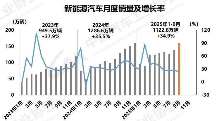1至9月,我國新能源汽車產銷分別完成1124.3萬輛和1122.8萬輛,同比分別增長35.2%和34.9%,新能源汽車新車銷量達到汽車新車總銷量的46.1%。其中,純電動汽車累計銷售722萬輛,同比增長44.7%;插混汽車累計銷售400.5萬輛,同比增長20.4%。