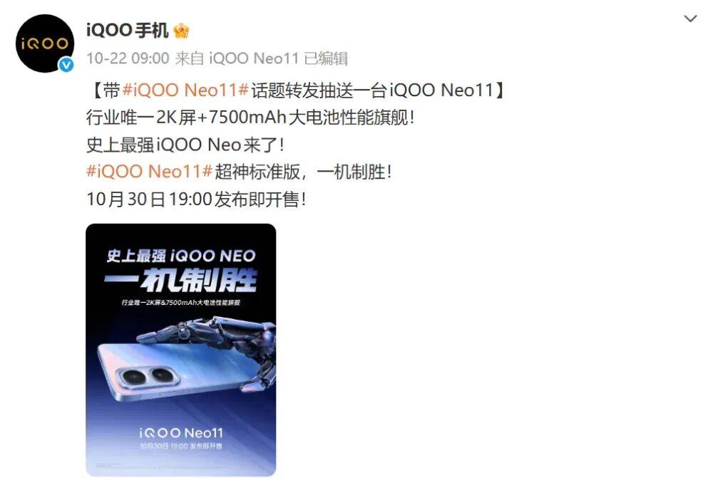 不久前,iQOO手機官方宣布,iQOO Neo11將于10月30日19:00發布即開售。