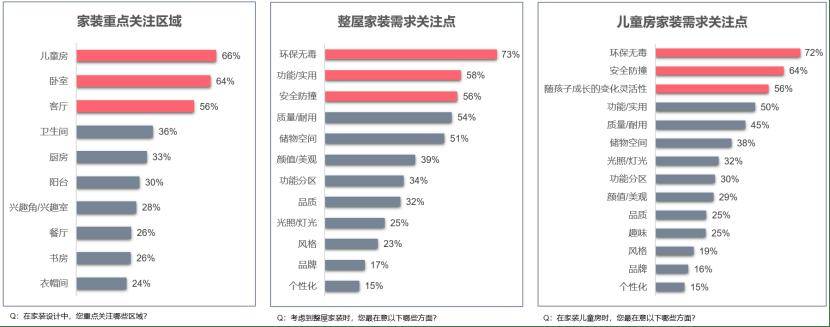 用戶最在意兒童房、臥室、客廳家裝區(qū)域;整體家裝關(guān)注環(huán)保無毒、功能/實用、安全防撞;
