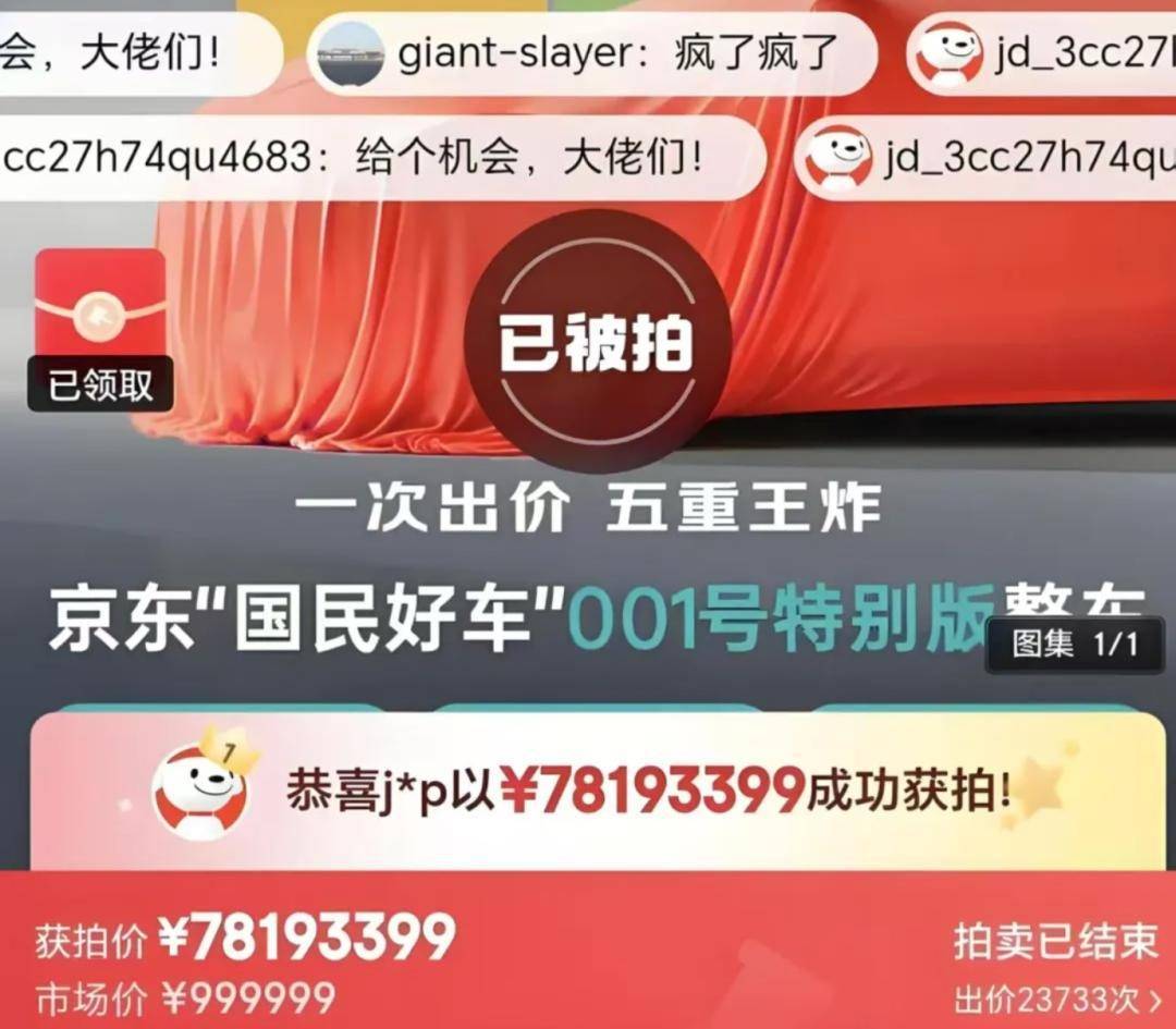 京東直接把“國民好車001特別版”搬上了拍賣臺,1元起拍,參與門檻極低,只需要100元的保證金,就可以給京東首輛車當榜一大哥。粉絲們高喊著“給個機會,大佬們”,短短4小時內,出價共計23733次,將成交價一路推至7819.3399萬元的天價,同時撬動27萬圍觀,成為今年最具話題性的線上拍賣事件,不少網友調侃稱“自己拿100元參與了上千萬的生意!”“這價格,我都懷疑是什么洗錢新套路了?!?/p>